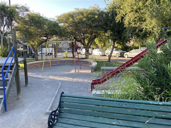 Jardín frontal frente a tranquila plaza