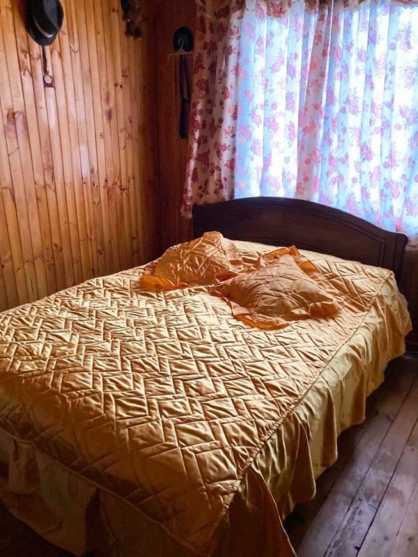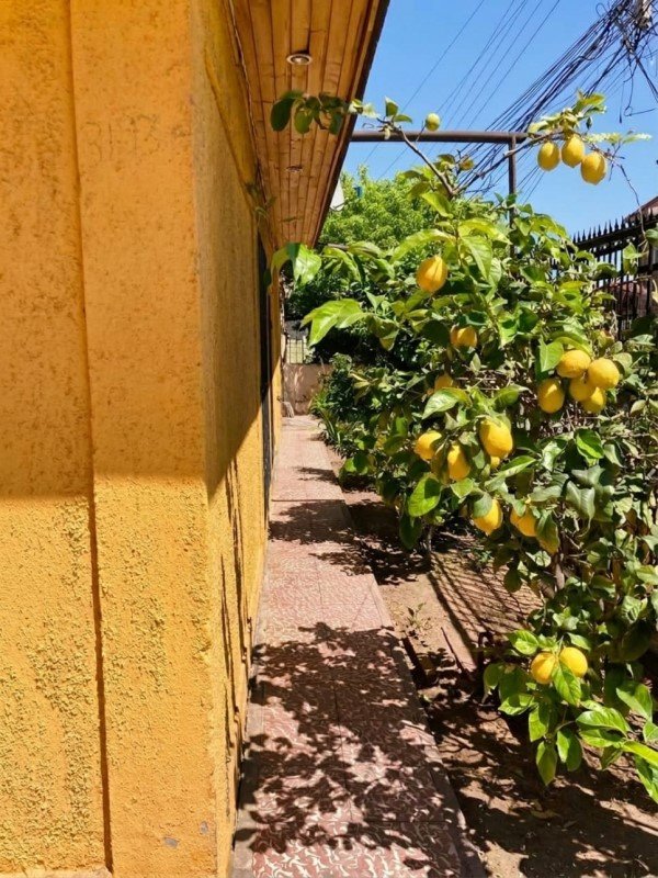 Tiene un Jardín grande delantero con arboles frutales y un jardín trasero grande con una lavandería pequeña en un costado.