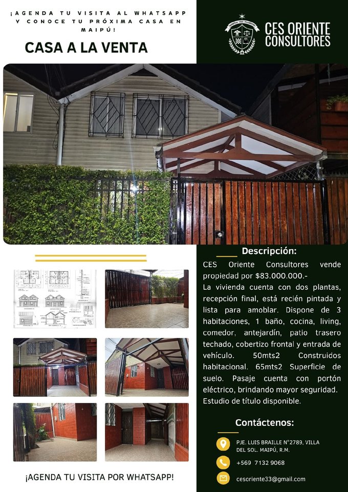 Esta propiedad genera alta plusvalía garantizada por su ubicación estratégica en Maipú,comuna con crecimiento urbano acelerado (+15% valor m² anual), demanda residencialexplosiva y millonarias inversiones en infraestructura (Autopista del Sol, Metro expansión).Villa del Sol consolida su atractivo con seguridad absoluta (pasaje cerrado con portóneléctrico), educación completa (jardines 5 min, colegios top 3-6 min, UDLA/DuocUC 4kms), salud inmediata (Hospital El Carmen 3 kms) y comercios totales (aCuenta 5 min, SantaIsabel a 1.7 kms). Ferreterias, farmacias, bencinera y gas abastible a 4 min caminando.