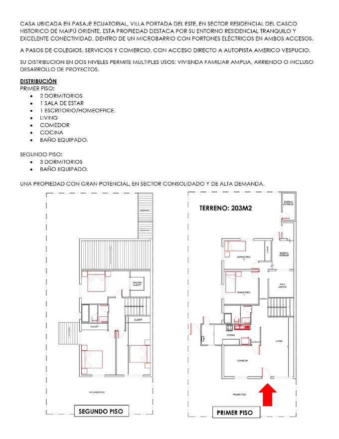 Casa ubicada en pasaje ecuatorial, villa portada del este, en sector residencial del casco historico de maipú oriente. Esta propiedad destaca por su entorno residencial tranquilo y excelente conectividad, dentro de un microbarrio con portones eléctricos en ambos accesos.