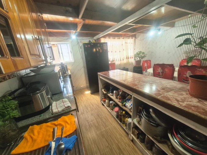 Gran cocina amoblada con excelente distribución y vigas a la vista