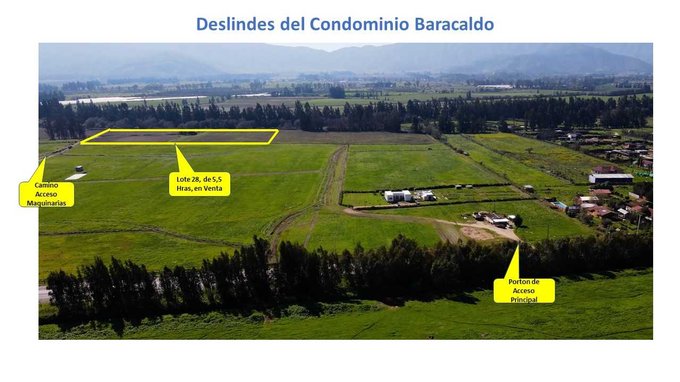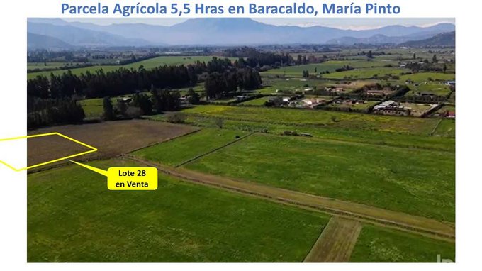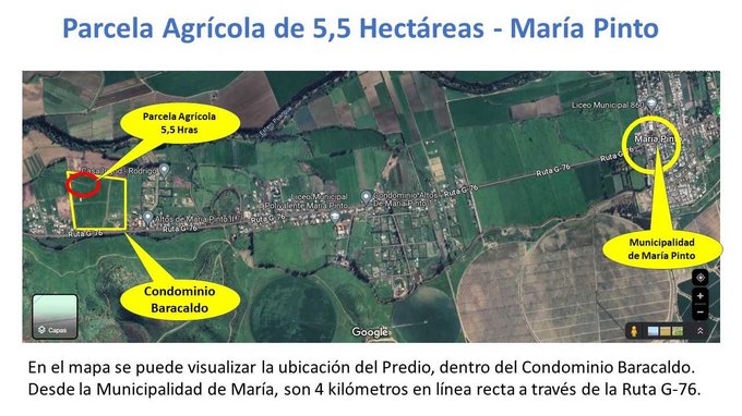 Parcela Agrícola de 5,5 Hectáreas ubicada en la Comuna de María Pinto, Región Metropolitana, dentro del Condominio de Baracaldo, a 4 kilómetros de la Municipalidad de María Pinto. Su acceso es a través del camino público (G76).