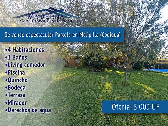 Se vende hermosa Parcela en Melipilla sector Codigua con casa de 93 mts2. Permiso de edificación aprobado. Derechos de aguas Inscritos y cuyo canal de regadío pasa por el interior de la propiedad. Valor oferta de 5000 UF. Esta propiedad de 5000 m2 ofrece un espacio seguro, cómodo y perfecto para vivir en un entorno natural y privilegiado, además de excelente calidad de vida gracias a sus servicios básicos bien desarrollados y un ambiente seguro para las familias. Acceso cerrado. ¡Esta parcela es ideal para quienes buscan vivir en armonía con la naturaleza sin renunciar al confort moderno!