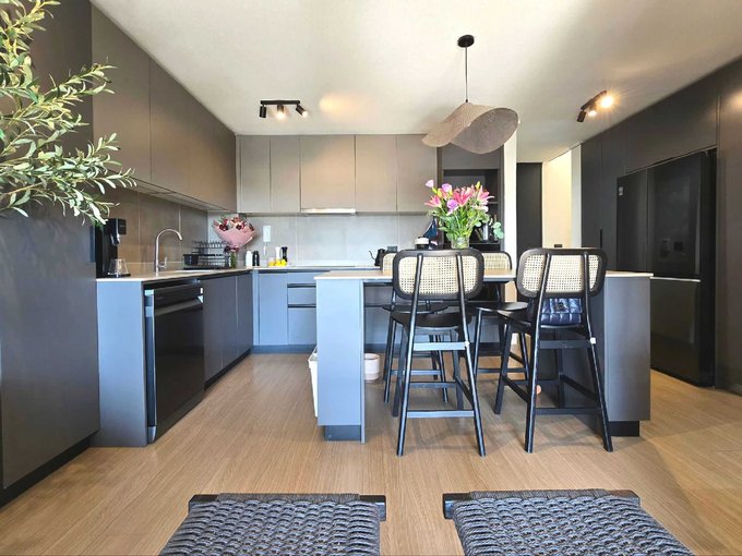 COCINA Integrada: Totalmente amoblada, con encimera vitrocerámica de 3 platos, horno eléctrico empotrado, espacio para instalación de lavavajillas y espacio para refrigerador de 2 puertas.