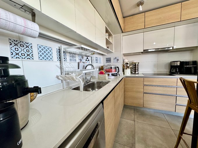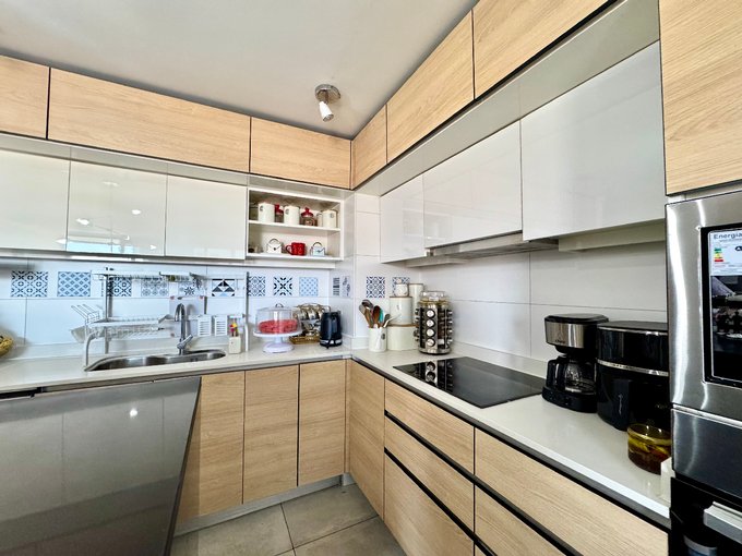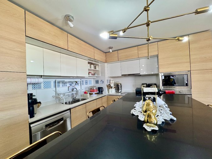 -Cocina americana con mesón isla, equipada con encimera vitrocerámica, campana y horno