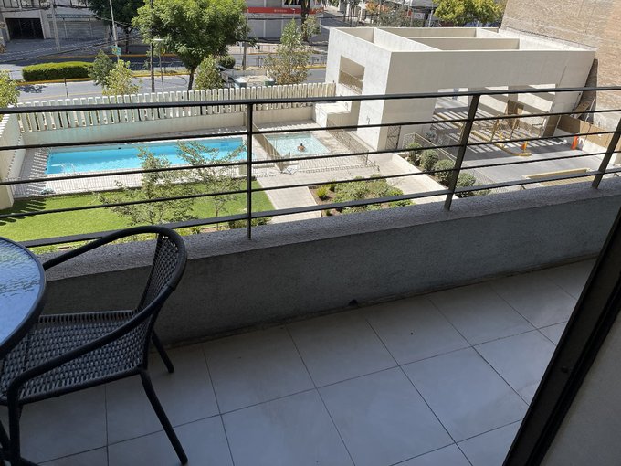 Se Vende departamento con dos estacionamientos y amplia terreza ( 7.29mt2), un dormitorio en Suite con walking closet , un baño ,cocina integrada,ventanal termopanel , piso flotante;en Condominio Vista Ñuñoa, emplazado en acera Sur de Avda. Americo Vespucio y Francisco de Villagra, edificio cuenta con 26 pisos , quedando esta unidad en el piso 5to, cuenta con piscina ,sala de Eventos, GYM, lavanderia, estacionamientos de visita, Conserjeria las 24 horas, a dos cuadra del metro Plaza Egaña y tres cuadra de metro Villa Frei. Gastos comunes aprox $100.000 mensual.Conectividad y equipamiento.