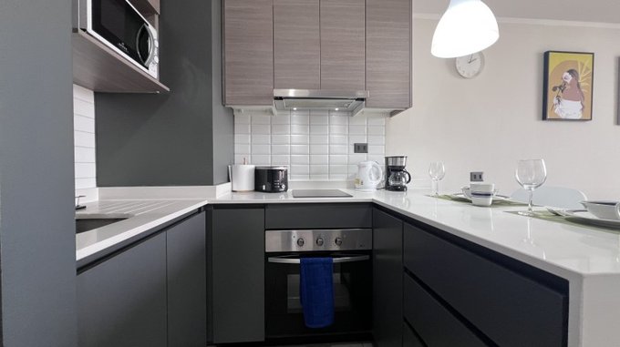 Mesón de cuarzo + cocina con muebles completos