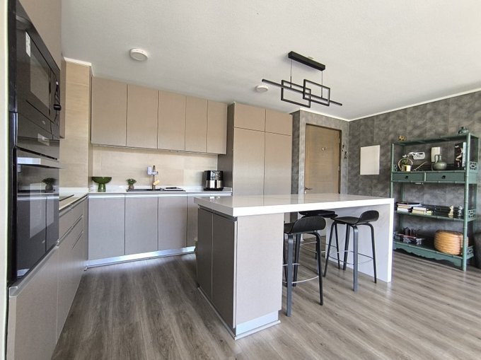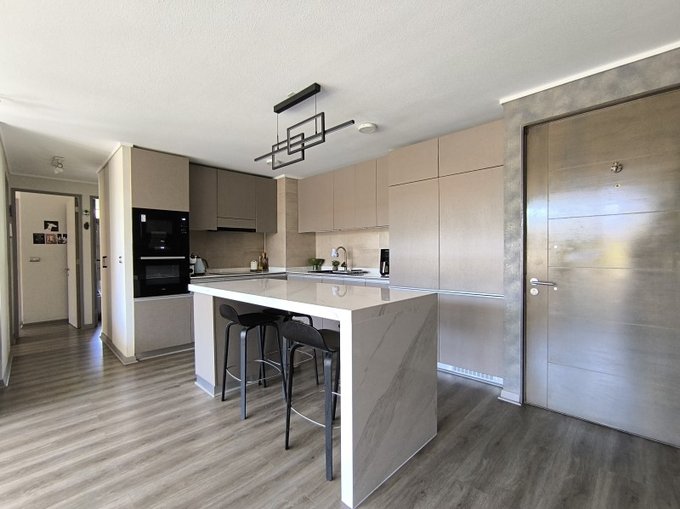 * Cocina incorporada, cubierta de cuarzo, totalmente equipada con excelente diseño. 2 Refrigeradores Panelados, cocina Encimera, Horno y Microonda eléctricos empotrados, Campana retráctil con salida de aire.