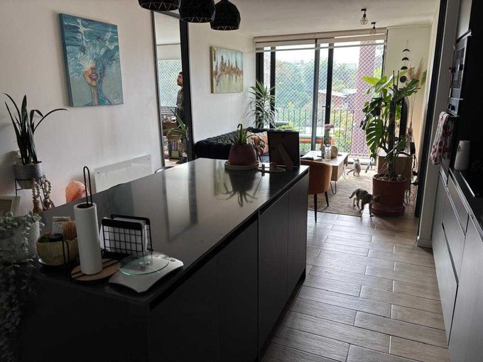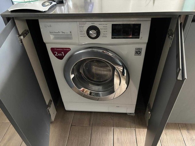 Living comedor juntos, cocina integrada y equipada, refrigerador empotrado, full eléctrico, amplia isla con conexión para lavadora y lavavajilla.