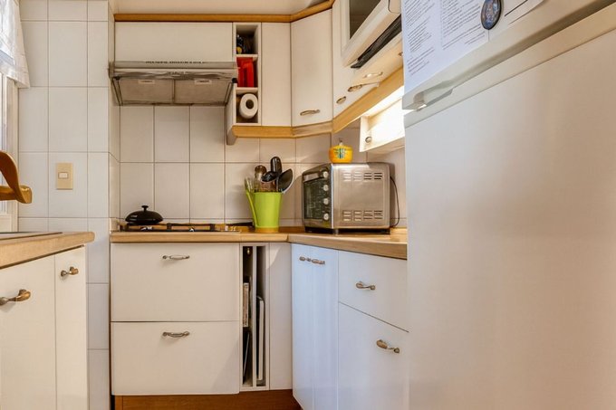 Cocina amoblada con muebles postformado y logia. Bodega interior.