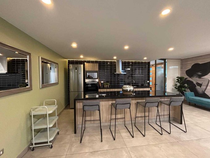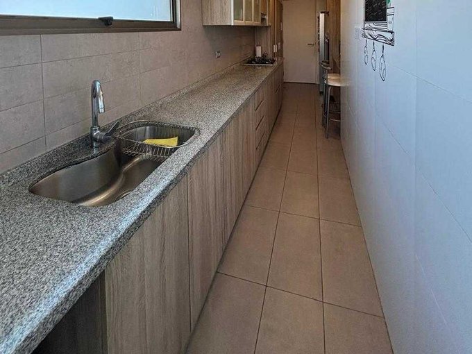 La cocina es amplia y funcional, equipada con encimera, horno empotrado y comedor de diario, además de una logia independiente con conexión para lavadora y lavadero. El departamento cuenta con calefacción central por radiadores, entregando confort durante todo el año.