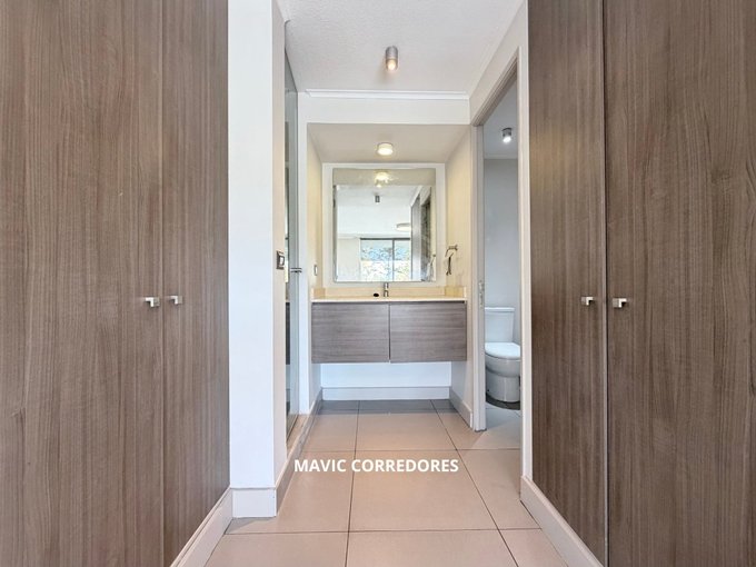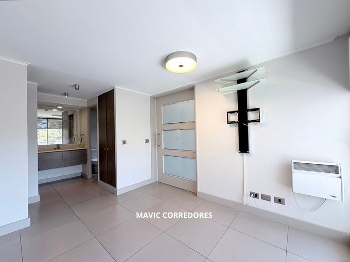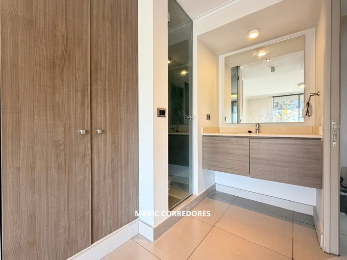 - Luminoso dormitorio principal con baño que se integra al ambiente, con lavamanos expuesto, ducha y WC cada uno en un espacio privado independiente.