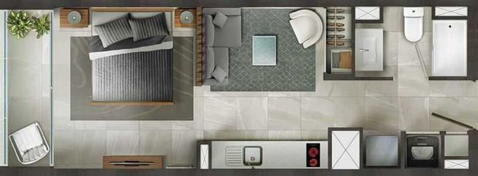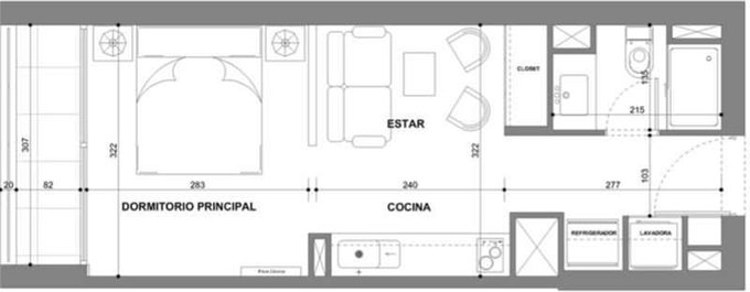 Consta de una superficie 29,83 m2, terraza 2,76 m2, superficie total 32,59 m2. El departamento cuenta con orientación poniente.