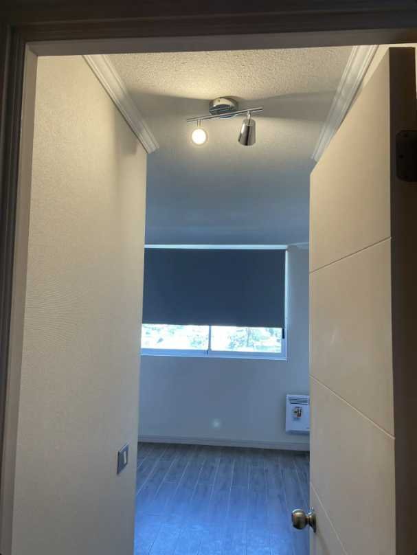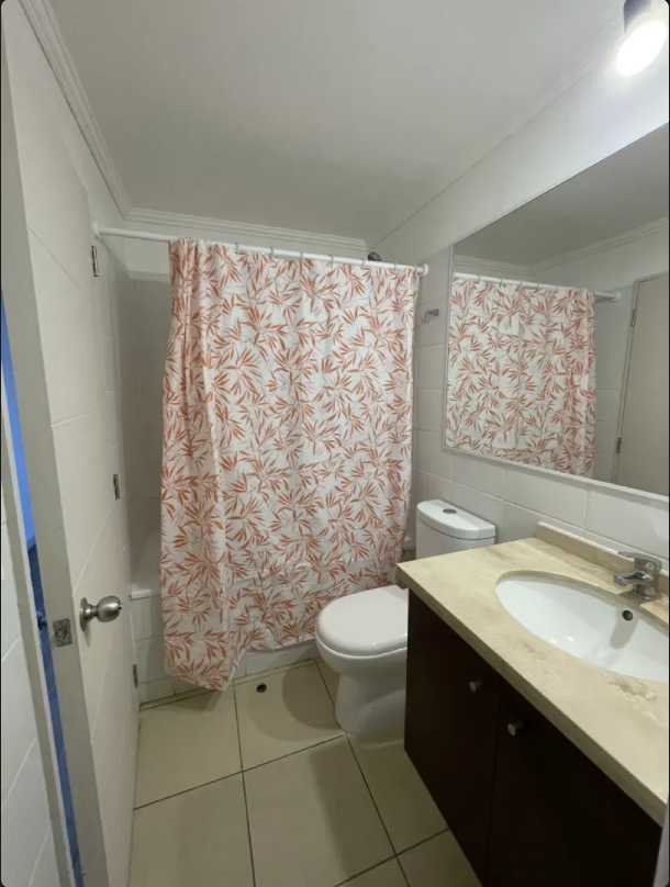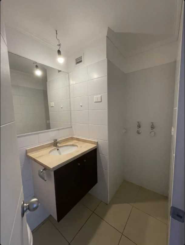 El dormitorio principal destaca por su buen tamaño, permitiendo una distribución cómoda del mobiliario y acceso cercano al baño. Este último dispone de lavamanos y ducha independientes, junto a un amplio espejo sobre el vanitorio. En todo el departamento predominan pisos de porcelanato, que brindan un estilo moderno, uniforme y de fácil mantenimiento.