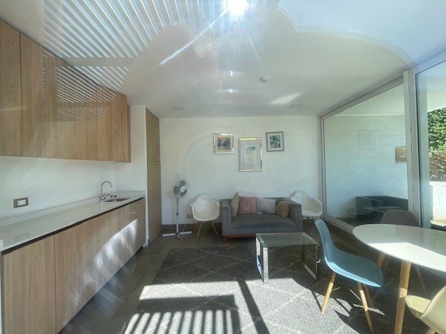 Cocina totalmente equipada: encimera vitrocerámica de 2 platos, horno eléctrico, campana retráctil y cubierta de cuarzo.