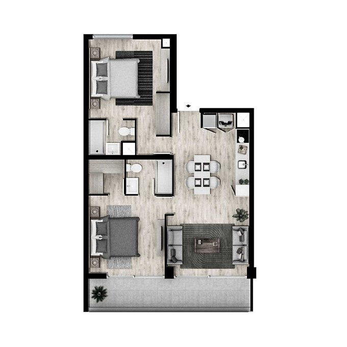 Este moderno espacio cuenta con 2 cómodos dormitorios y 2 baños perfectamente diseñados para tu confort. Con un total de 72 metros construidos y una amplia terraza de 11 metros, tendrás espacio suficiente para disfrutar de momentos inolvidables.