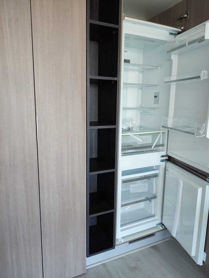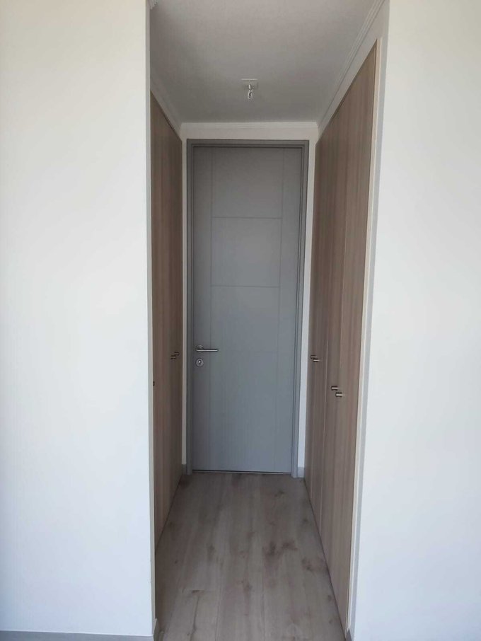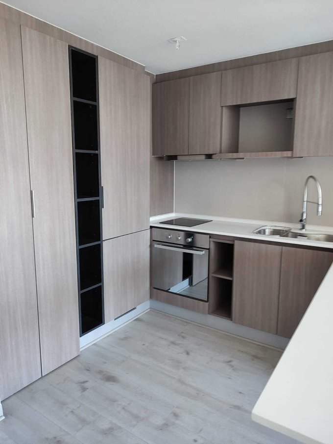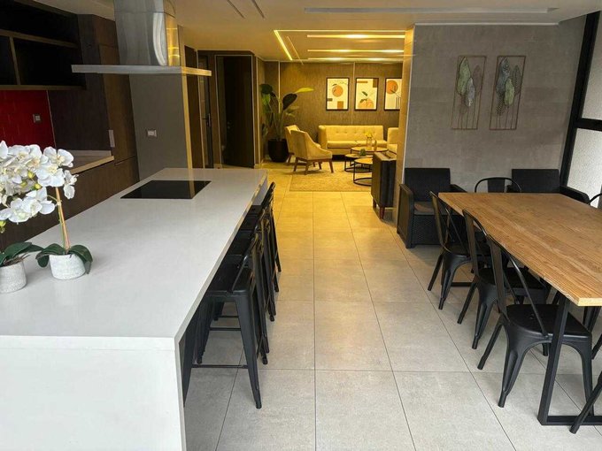 Terrazas con barandas de cristal templado, ventanas termo-panel, papel mural texturizado, piso flotante, cubierta de cuarzo, cenefas iluminadas, muebles enchapados en melamina, horno eléctrico, campana cocina.