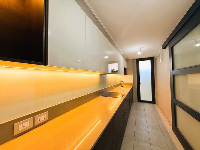 - Cocina semi-integrada, con moderna puerta corredera tipo galpón, con cubiertas de granito, iluminación led bajo muebles, equipada con encimera de vitrocerámica de 4 platos; horno y microondas empotrados y campana eléctricos, todo marca Teka.
