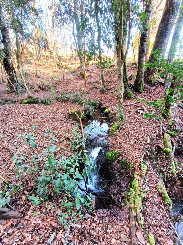 Terreno plano de suave pendiente qué conecta con el bosque más una vertiente de agua de manantial qué pasa al fondo del sitio.