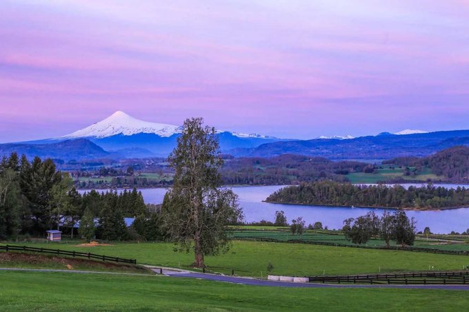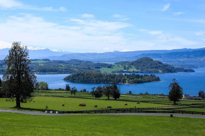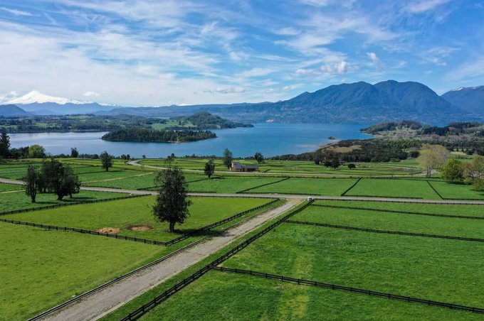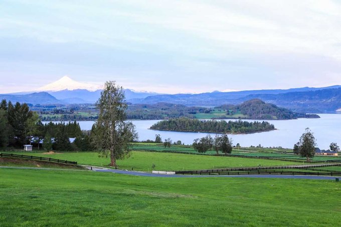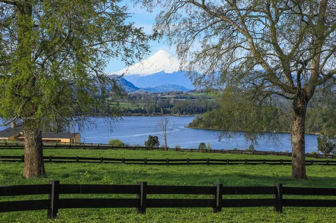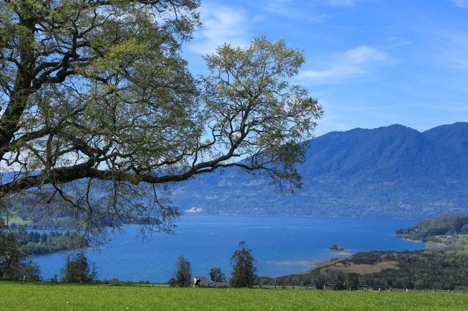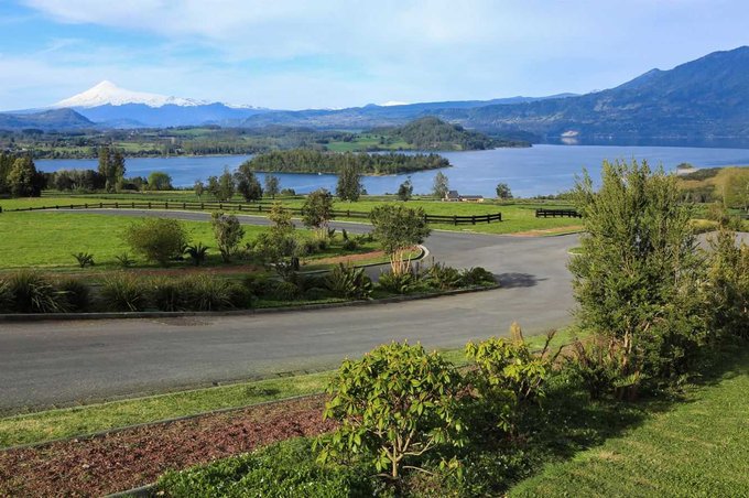 Vista total al lago y volcanes Villarrica y Choshuenco