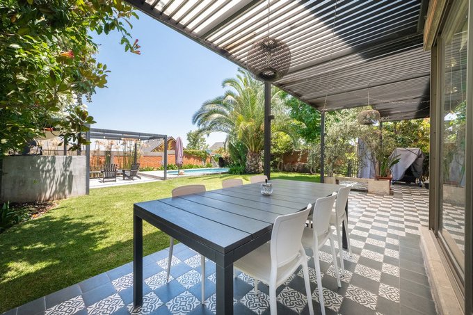 Piscina, terraza privada al fondo del jardín con riego automático y áreas verdes formadas