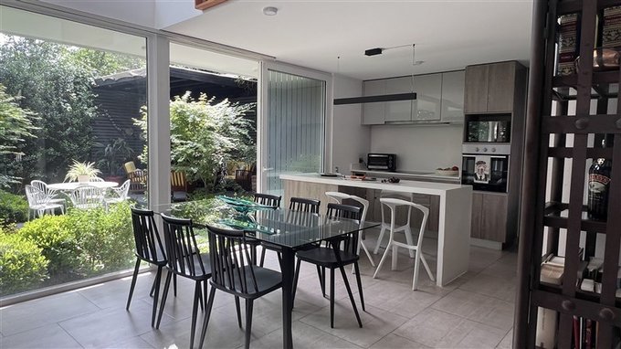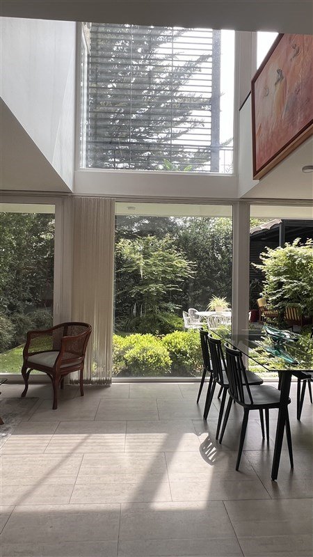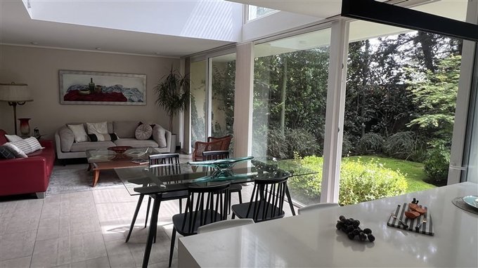 Living comedor amplio con ventanales de piso a cielo y salida al jardín