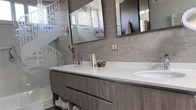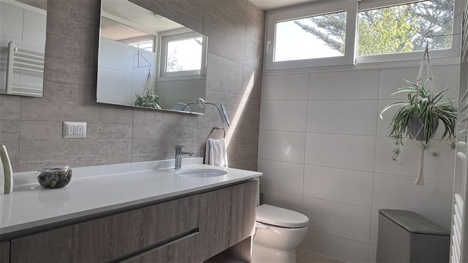 Baño en suite con doble lavamanos, luz y ventilación natural