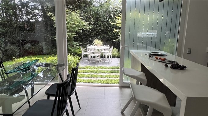 Gran sala de estar con terraza y vista al jardín