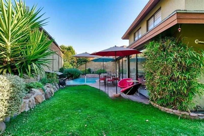 patio con terraza y piscina con cascada.