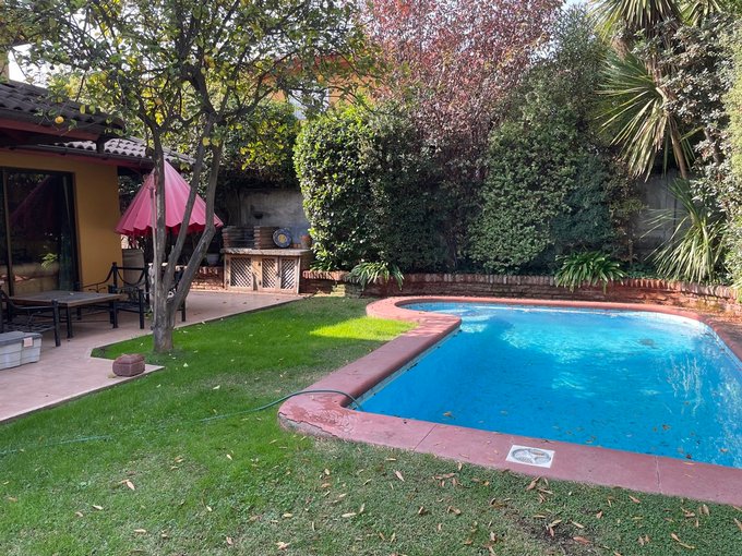 Hall de entrada, living comedor amplio con salida a jardín con terraza , piscina y quincho, cocina tradicional y comedor de diario con salida a patio de servicio con bodega, escritorio con baño.