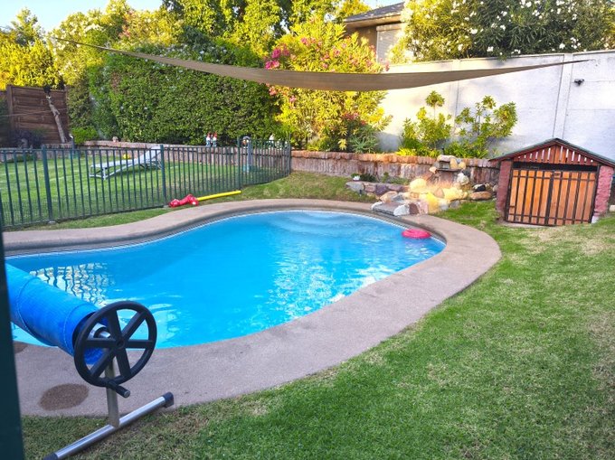 - Patio con cerco verde, terraza exterior y piscina temperada con cerco de seguridad.