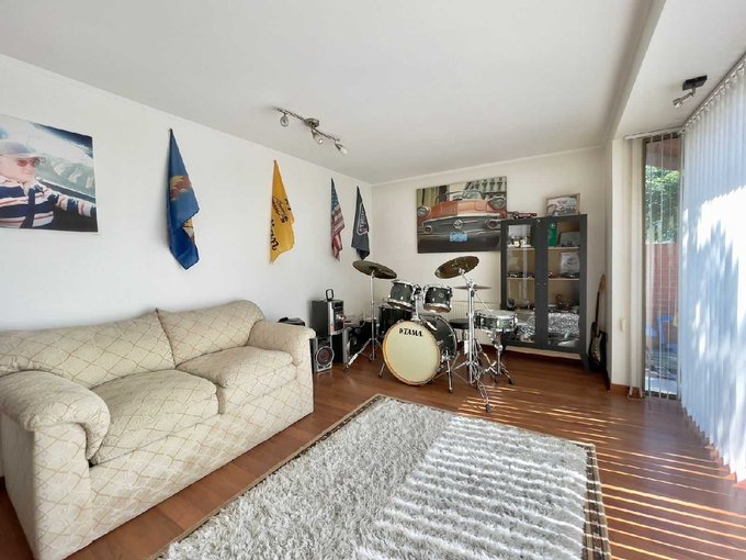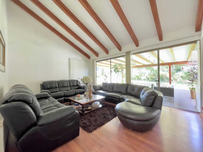 - Living de doble altura con hermosas vigas a la vista en pendiente que se confrontan con amplios ventanales que dan paso a la terraza y jardín