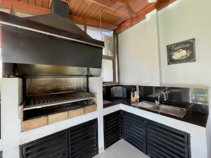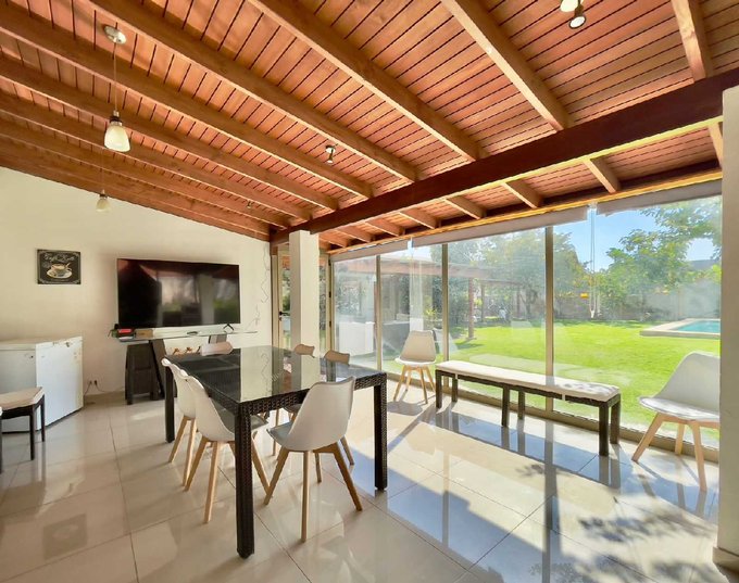 - Quincho cerrado con amplios ventanales que permiten la vista al jardín
