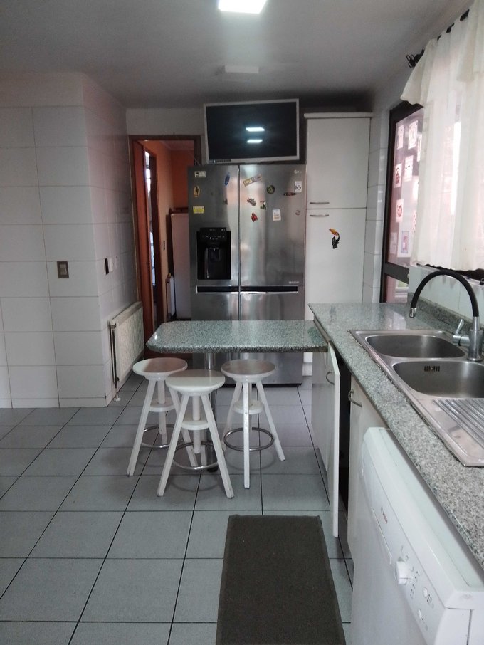 Hall de distribución con baño de visitas y espacioso closet, living comedor separado con salida a terraza y gran jardín formado con tres terrazas y lindos rincones; piscina. Cocina con comedor de diario, cubierta de granito, despensa, equipada con horno eléctrico, encimera a gas, extractor de aire, lavaplatos doble y gran capacidad de almacenamiento. Esta se conecta con dormitorio de servicio y baño y con loggía techada y cerrada.