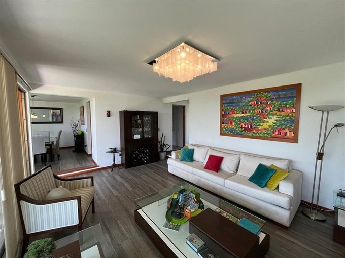 Amplia sala de estar familiar, con salida a un balcón de generosas dimensiones y vista hacia la ciudad.
