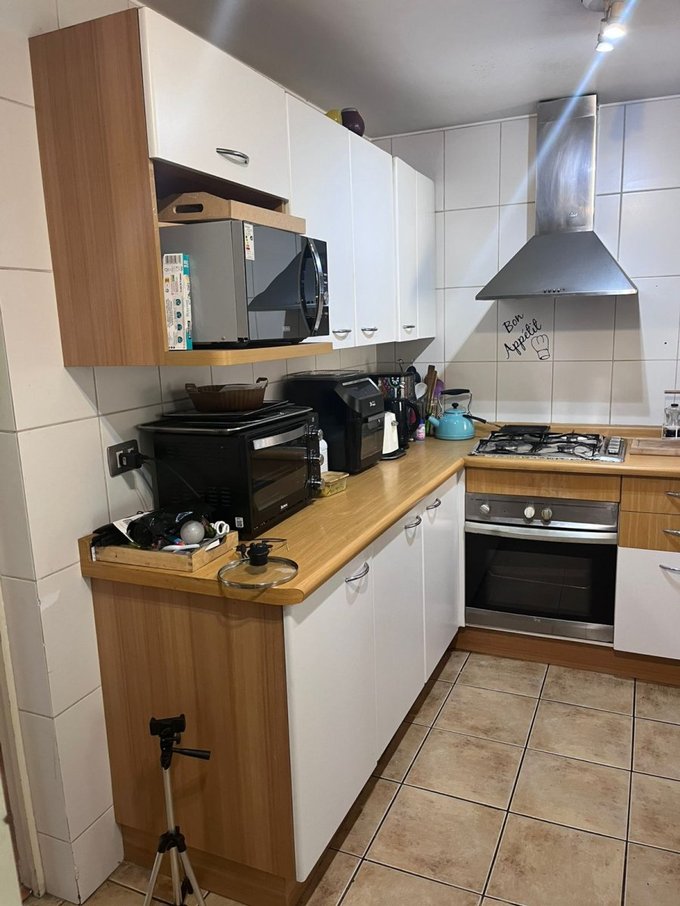 Cocina amoblada y equipada con encimera, campana y horno eléctrico