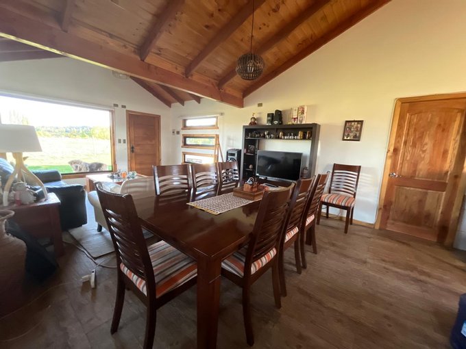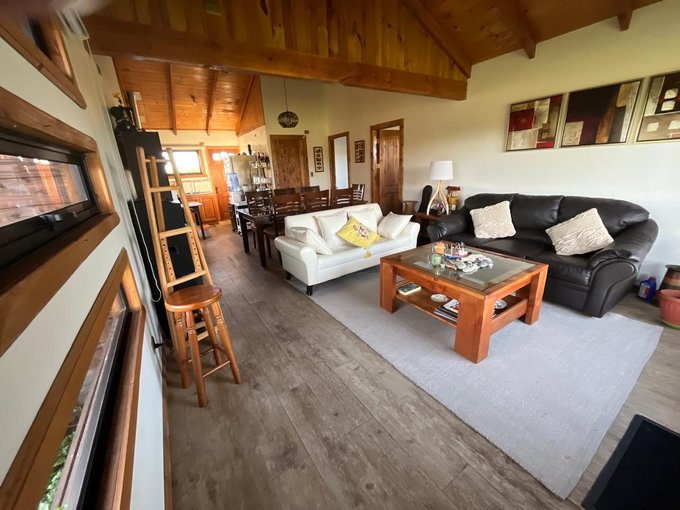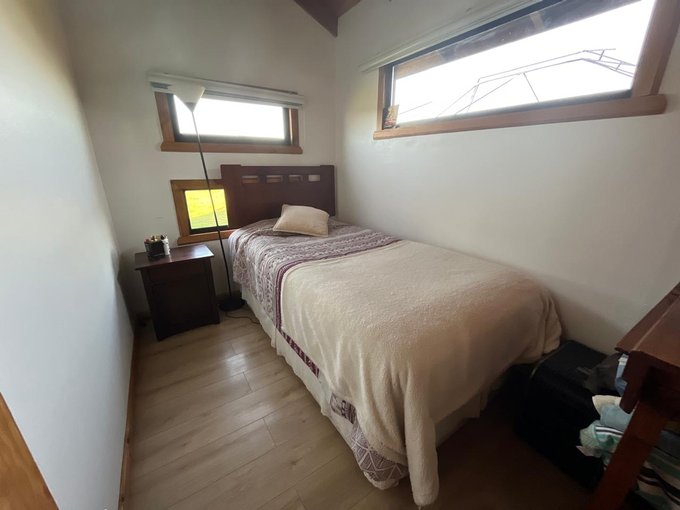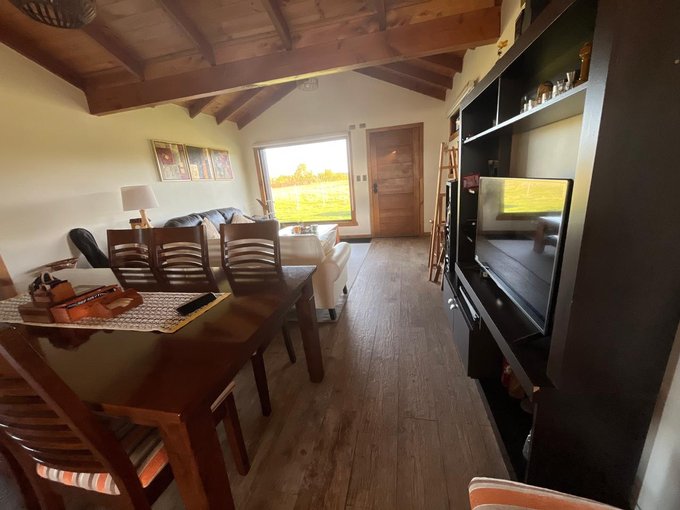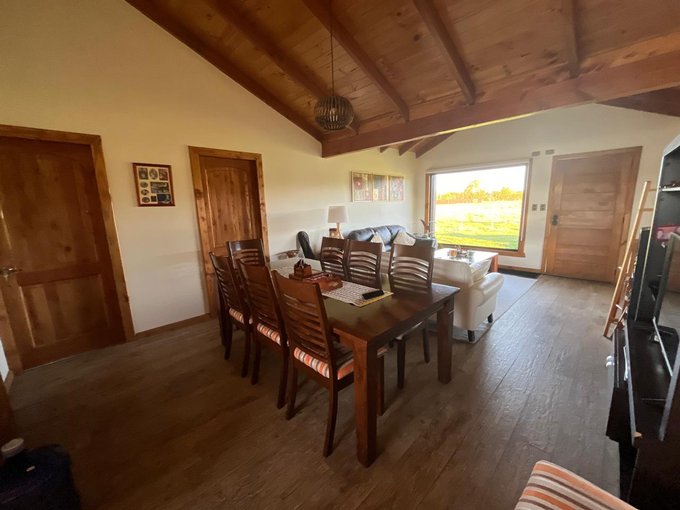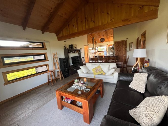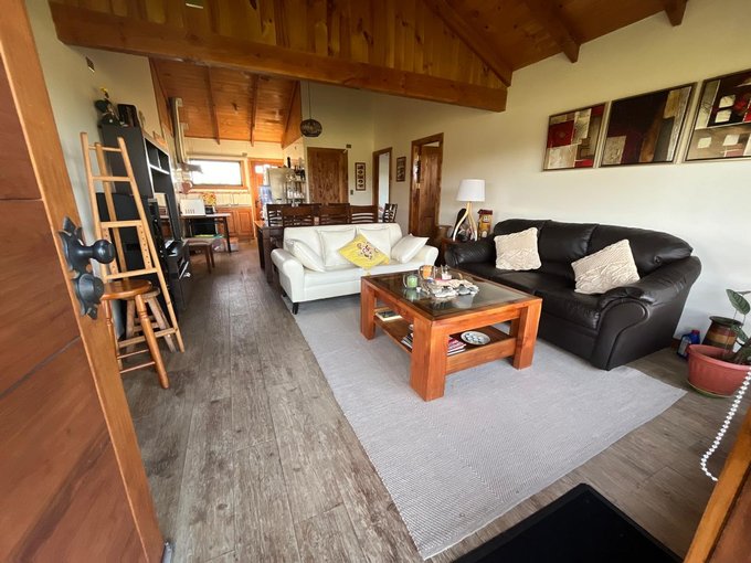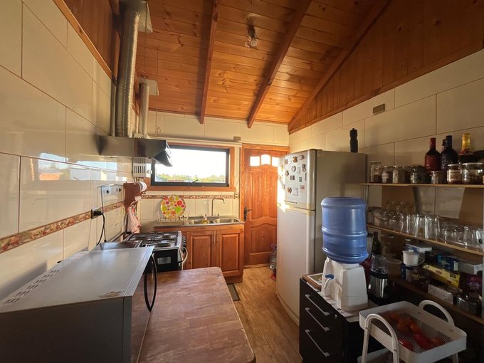 La casa cuenta con living comedor, cocina integrada, 3 dormitorios y dos baños; construida con pino oregón, en su interior vigas a la vista, piso porcelanato en living comedor y cocina, en dormitorios piso flotante, baños paredes y piso cerámica, todas las puertas interiores y exteriores de pino oregón., techo de teja contínua.