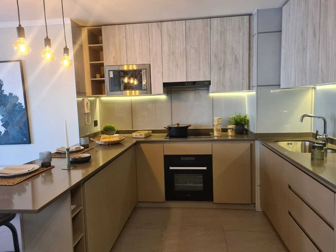 Cocina equipada con encimera, horno, microondas y campana.