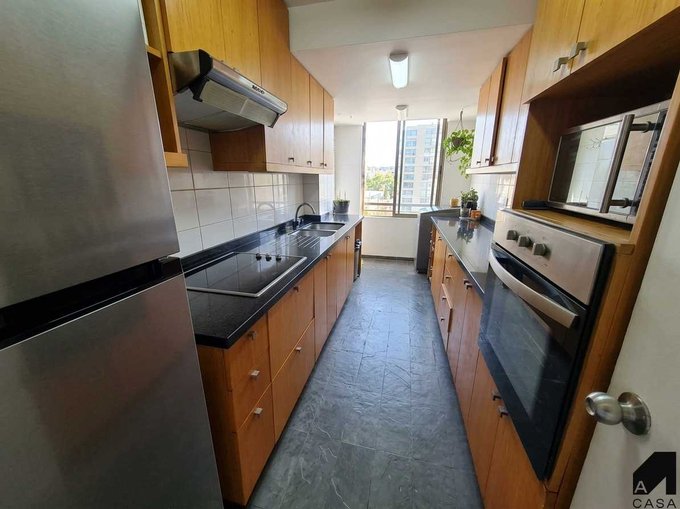 Programa: Hall, amplio living con comedor doble altura y salida a amplia terraza con vista despejada hacia el norte y oriente, iluminada cocina, full equipada: horno eléctrico empotrado, cocina encimera a gas, cubierta de granito, 1 dormitorio y 1 baño en suite en el nivel de acceso.