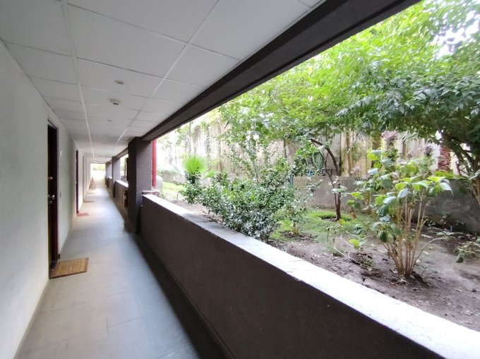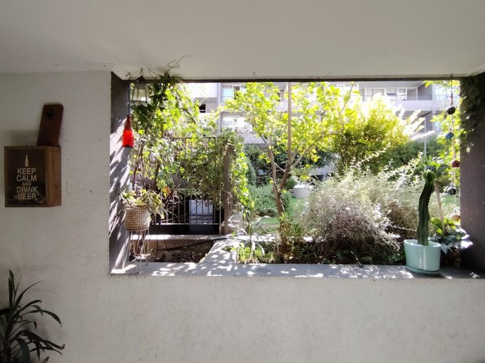 - Terraza con vista a los jardines del condominio.