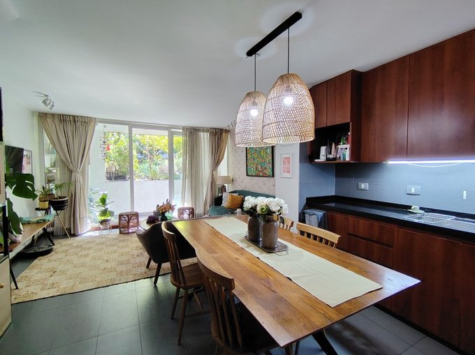 - Cocina abierta, con gran capacidad de almacenamiento; amoblada y equipada con encimera, horno, campana y lavavajillas; 100% eléctrica.