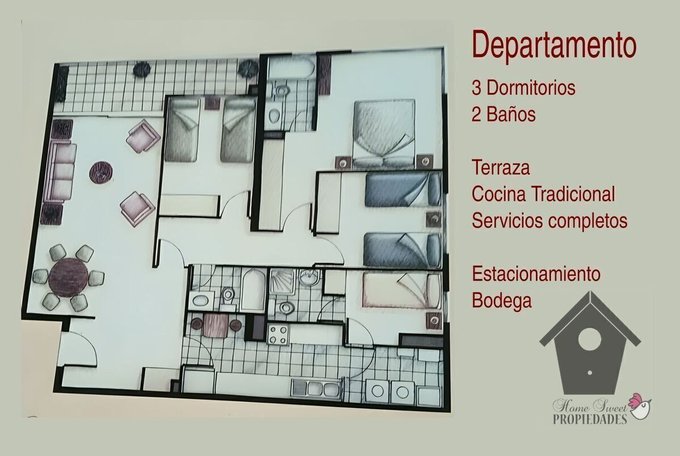Piso de cerámica en todo el departamento. Terraza cerrada habitable. Cocina amoblada y equipada con encimera a gas y horno eléctrico empotrado y campana extractora. Baño principal con ventana. Agua caliente con cálefon en la logia.