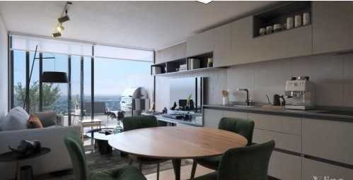 Puerta de ingreso a Living y comedor con salida a terraza de 14,1 m2, cocina integrada, full equipado con encimera, horno, campana, microonda y conexión a lavadora.