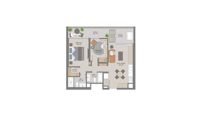 Puerta de ingreso a Living y comedor con salida a terraza de 14,1 m2, cocina integrada, full equipado con encimera, horno, campana, microonda y conexión a lavadora.