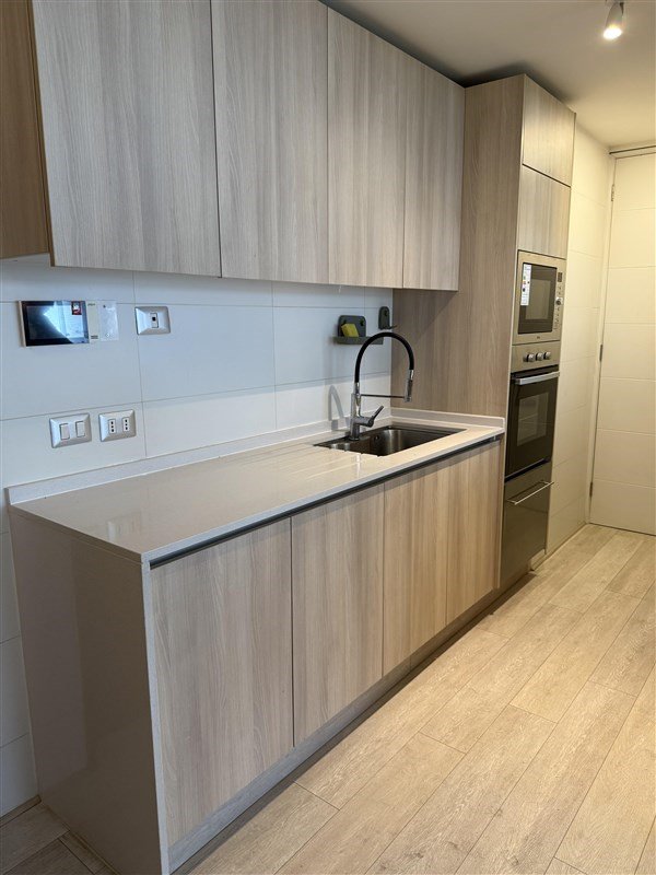 La cocina está completamente equipada con extractor, encimera de vitrocerámica, horno, microondas, lavavajillas. Además cuenta con un espacio cerrado especial para la instalación de la lavadora y almacenamiento de insumos de lavado y el termo electrico de 100 L.