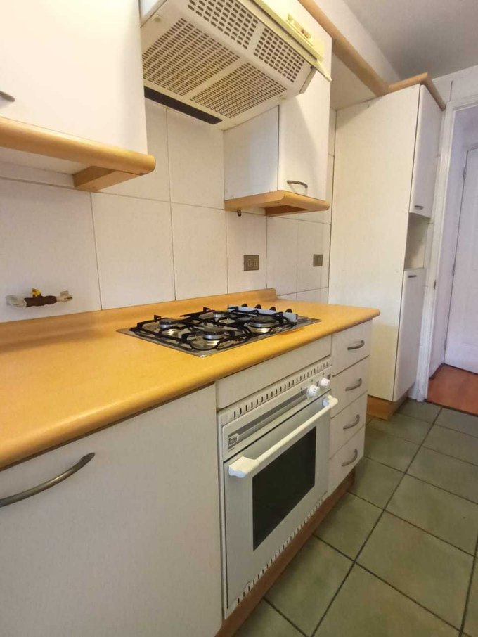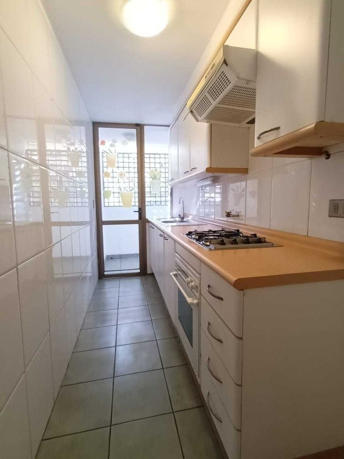 Cocina independiente y amoblada, equipada con horno, cocina encimera y campana, a un costado la logia con conexión a lavadora.