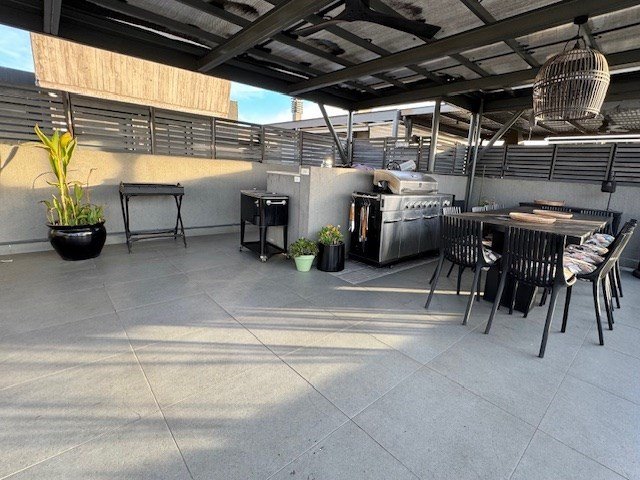 2 dormitorios (ppal suite), 2 baños, 2 estacionamientos, 1 bodega, gran terraza con quincho y piscina.