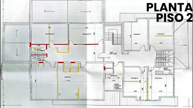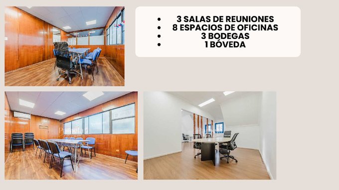 - Segundo piso: 3 oficinas, 2 salas de reuniones, 1 salón, 1 bodega, 3 baños.