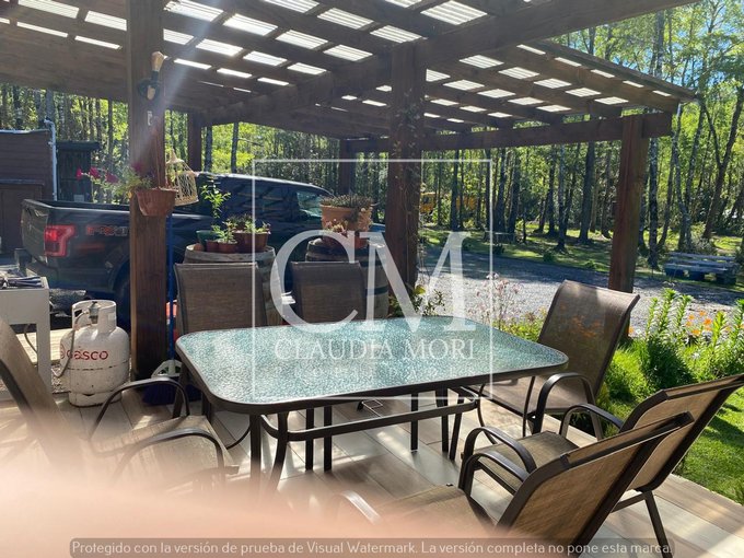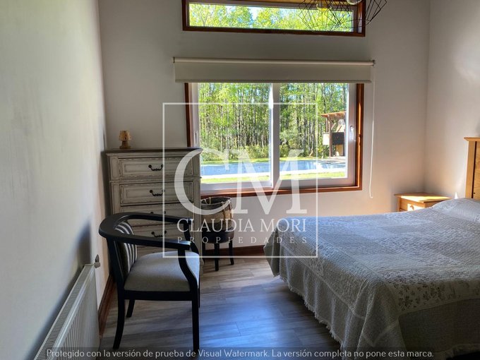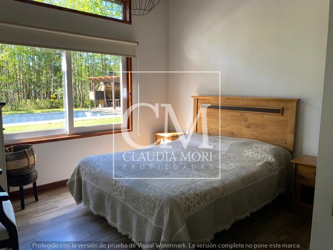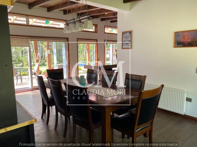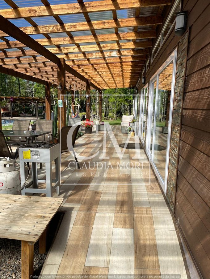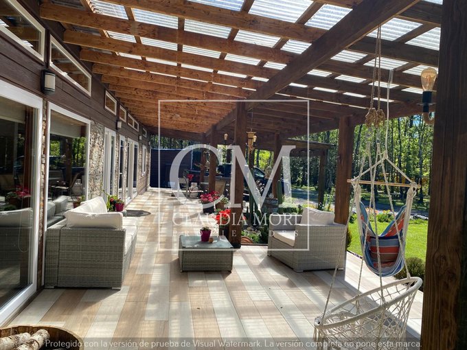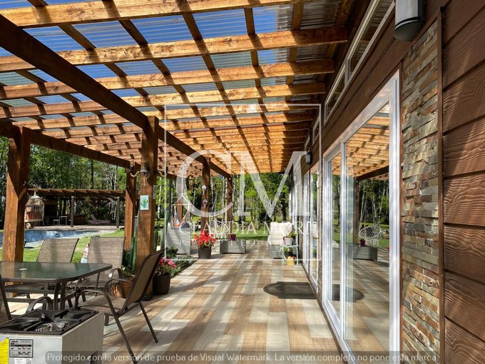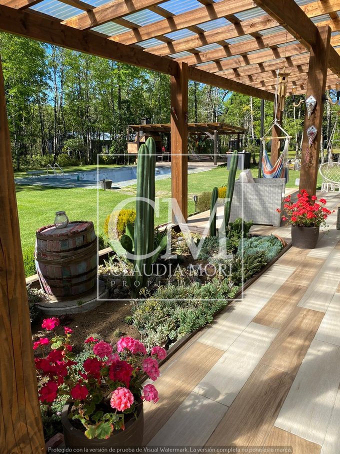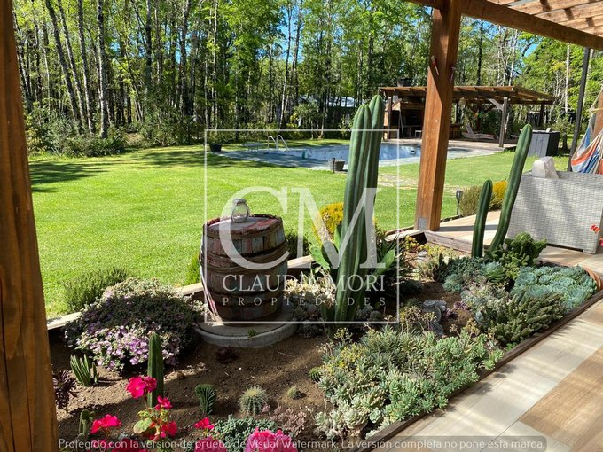Amplio parque y jardin con piscina, quincho, bosque nativo y cancha de fútbol.