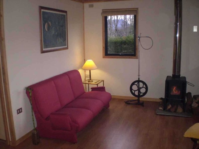 Construcción en madera con revestimiento exterior de madera e interior en placas de yeso. Techo de teja asfáltica. Ventanas con marcos metálicos (2 con termopanel).